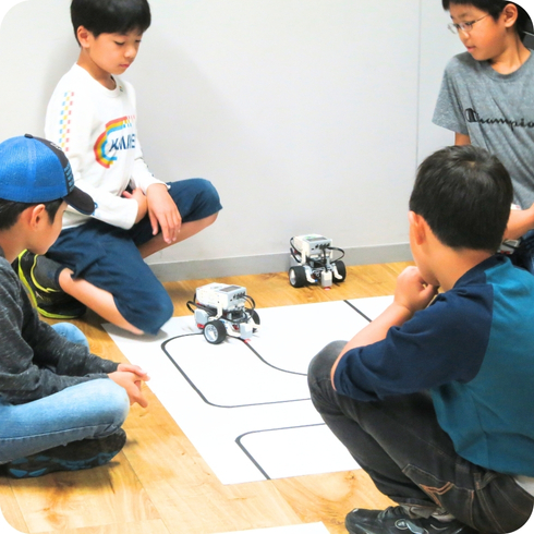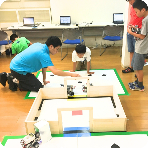 高校生まで在籍する本格的なロボットプログラミングコース。モーターとセンサー制御の基本からスタートし、世界的なロボコンを題材にオリジナルの自律型ロボットを開発。論理的に、推論、検証と修正をくり返し、前に進みながら考える力を、楽しみながら身につけていきます。