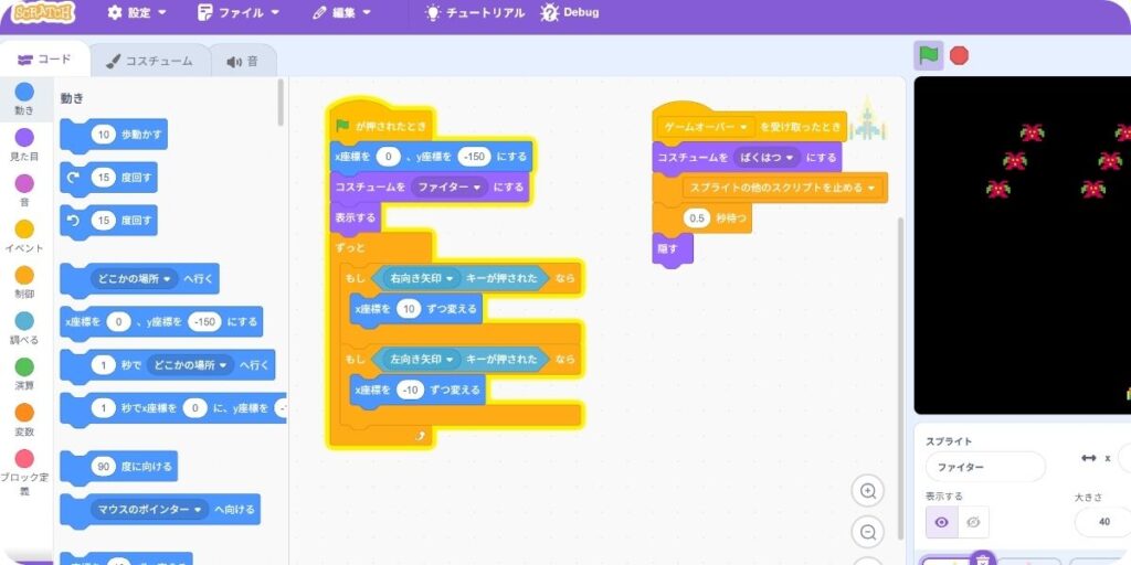 画面上のキャラクターや絵を、ブロックを組み合わせるように動かしていくため、直感的に操作できます。